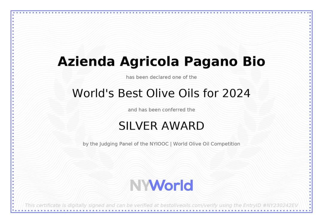 Erneute Anerkennung bei der New York International Olive Oil Competition (NYIOOC) mit dem Silberpreis als eines der weltweit besten Olivenöle.